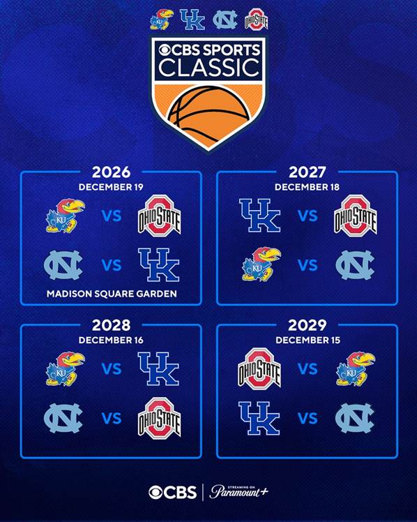 The 2026 CBS Sports Classic will be held on Saturday, Dec. 19 and will return to Madison Square Garden in New York City. The doubleheader matchups for this year’s event will include Kansas facing Ohio State and North Carolina taking on Kentucky.