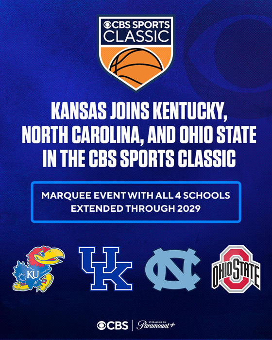 The CBS Sports Classic has added Kansas to its annual college basketball showcase featuring four of the nation’s top programs, joining Kentucky, North Carolina and Ohio State. The signature doubleheader, which began in 2014 and is broadcast each year on The CBS Television Network and streamed live on Paramount+, has been extended through 2029 with all four schools.